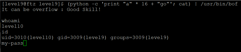 그렇다면 프로그램을 실행하고 위와 같이 'a'를 16개 써준 후 go를 입력해주면 "Good Skill!" 문자열이 뜨게 되고 level10의 셸을 얻을 수 있다.