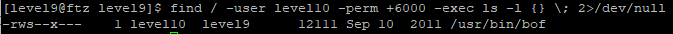 find / -user level10 -perm +6000 -exec ls -l {} \; 2>/dev/null