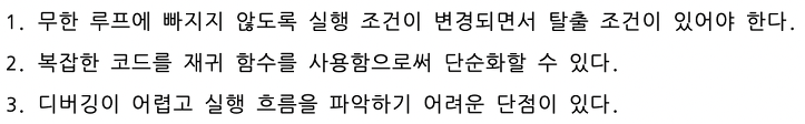 재귀 함수를 이용하여 프로그램을 작성할 때 디버깅 및 실행 흐름을 파악하기 어렵다는 단점이 있지만