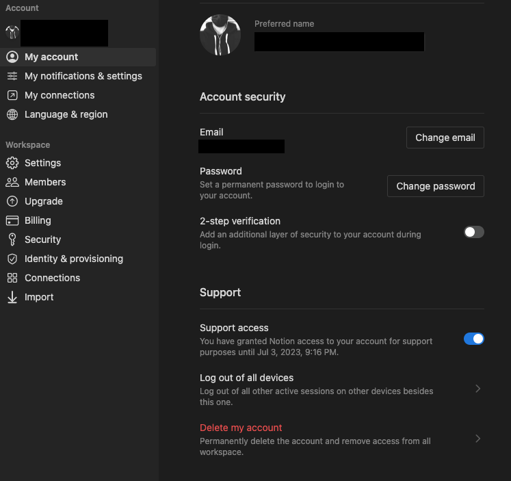 이메일이 오기 전에 구글링 통해 나와 같은 상황의 사람들을 보니 노션에서 위와 같이 setting & members -> my account -> "Support access" 을 활성화 시켜줘야 한다.