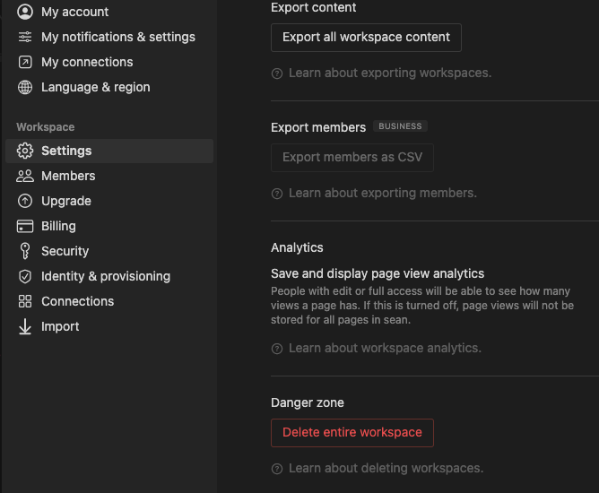 그렇게 notion에서 이곳 저곳을 둘러보던 중 Danger Zone을 발견했는데.. Danger Zone이다보니 워크 스페이스를 삭제하는 것 아닌가 하는 나름의 합리적인(?) 의심이 들었다.