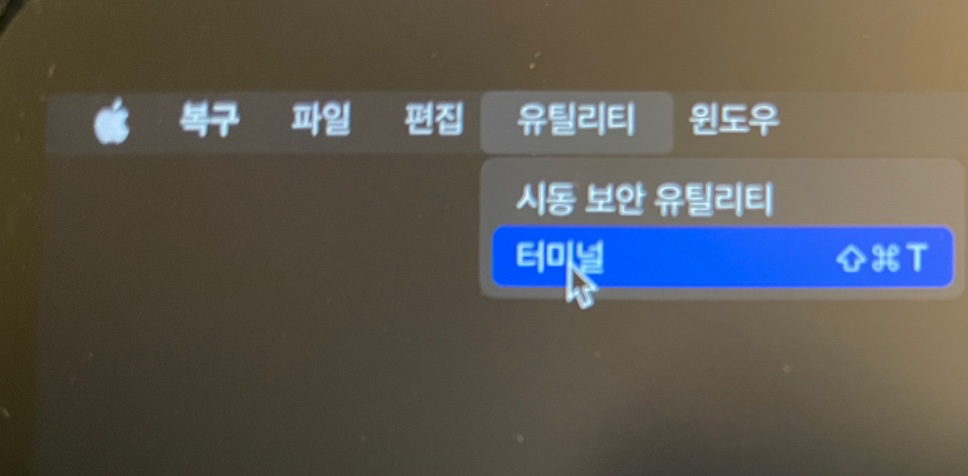 위의 탭들 중 "유틸리티" -> "터미널"을 누르거나 Shift + Command + t 키를 눌러 터미널을 열고