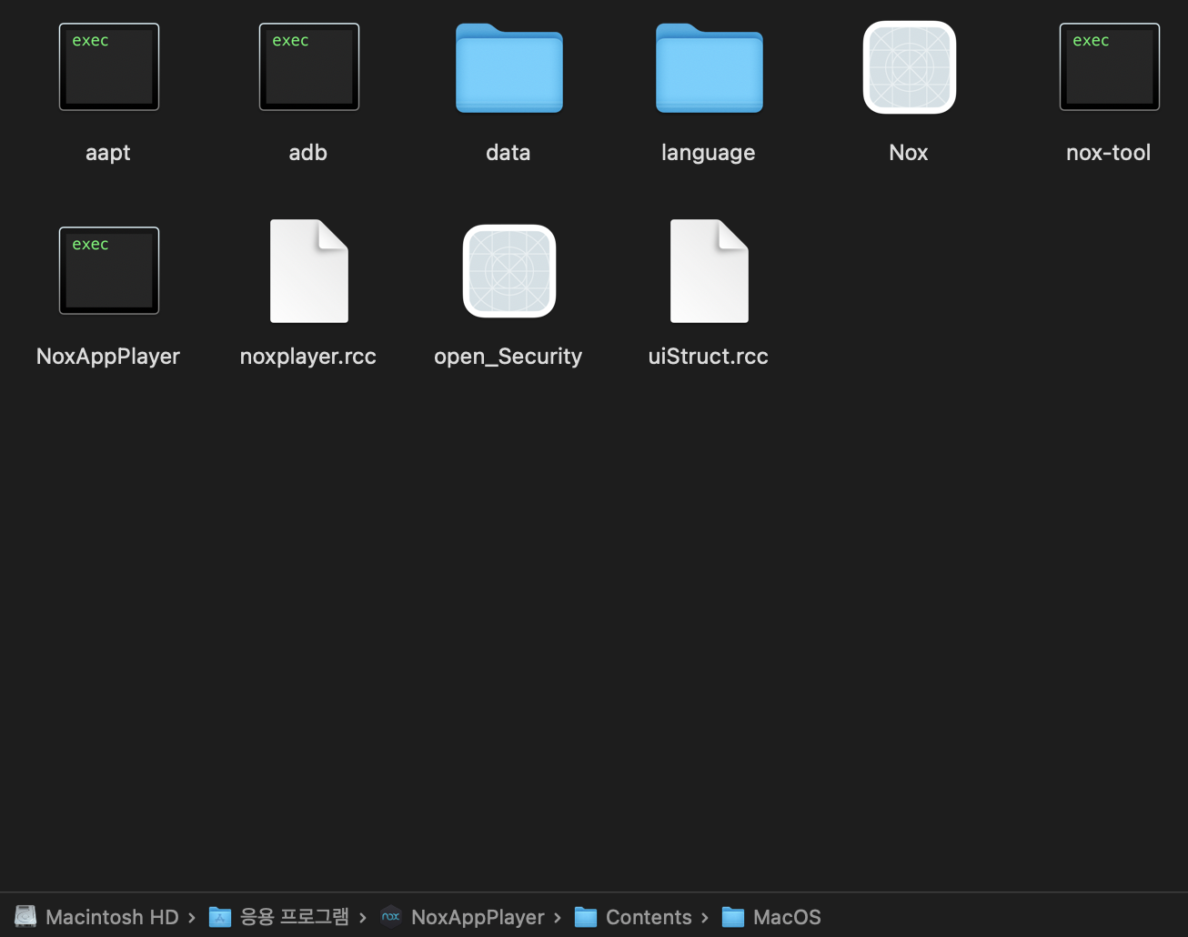 contents -> MacOS -> NoxAppPlayer가 실행파일이다.