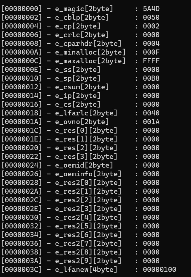 IMAGE_DOS_HEADER 구조체 멤버 e_magic과 IMAGE_NT_HEADER 구조체 멤버 Signature을 검사하여 dos 파일 및 pe 파일이 맞는지 확인한다.