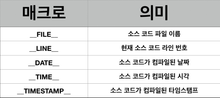 참고로 C 언어에는 정의하지 않아도 프로그램 개발에 도움을 주기 위해 미리 정의되어 있는 매크로가 있다.