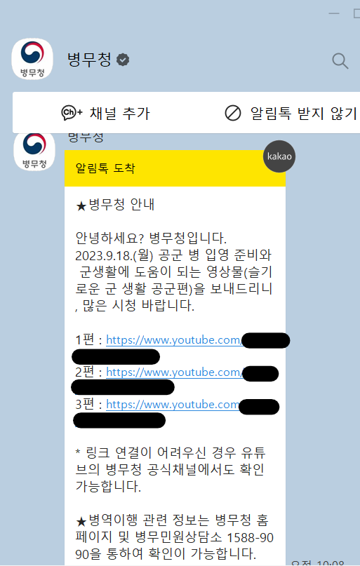 가면 훈련소 생활을 어떻게 진행되나 보급품은 어떤 것들을 주나 훈련은 어떤 것들을 하나 등 훈련소와 특기학교에 관련된 내용들을 알려주는 youtube 영상 링크를 위와 같이 톡으로 병무청에서 보내주면, 정주행 한 번 싹 하면 된다.