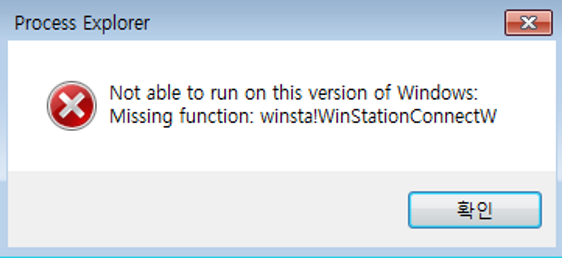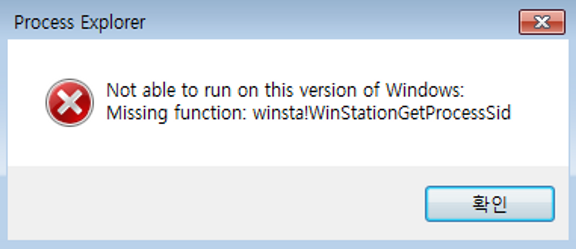 Windows 7 64bit 환경에서 최신 버전의 Process Explorer를 실행하니 위와 같이 winsta.dll 파일에 있는 API 함수를 호출하지 못해 Process Explorer를 실행할 수 없는 것 같다.