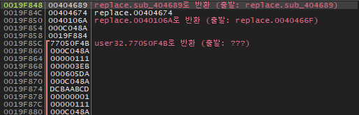 , 40469F 주소를 스택에 넣은 후 404689 주소에 있는 함수를 호출하므로 4048D0 주소의 값은 60163605가 되고