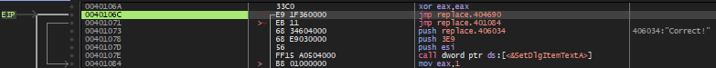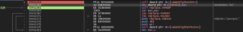그렇다면 eax에 401071이 들어가게 된다면, 40466F 주소의 함수에서 401071 주소에 0x90과 401072 주소에 0x90을 넣기 때문에 401073 주소의 "Correct!" 문자열을 스택에 넣는 명령이 실행될 것이다.