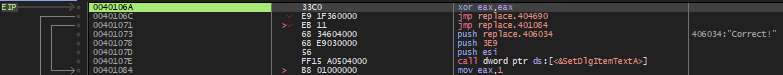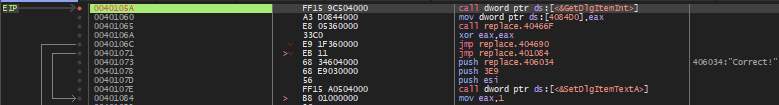 그러면 위와 같이 401073 주소에서 "Correct!" 문자열을 스택에 넣고 이어서 40107E 주소의 GetDlgItemTextA() API 함수를 통해 출력하는 것 같은데, 문제는 401073 주소로 조건 분기하는 부분이 없다는 것이다.
