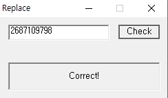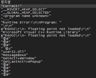 x32dbg의 문자열 찾기 기능을 이용해보니 위와 같이 뜨고, "Correct!" 문자열이 보인다.