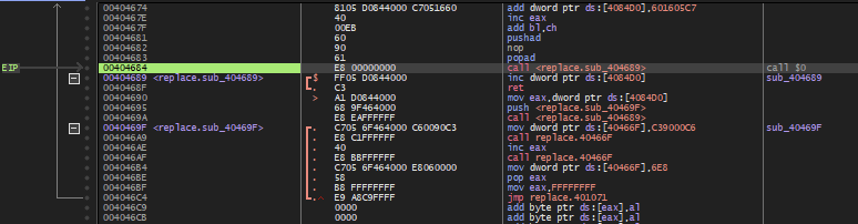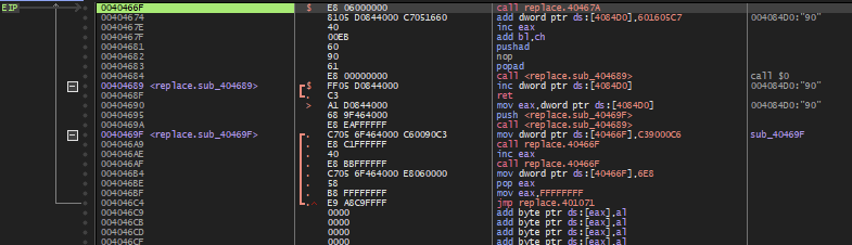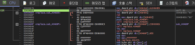 4046AE 주소에서 eax에 들어있는 값을 1 증가시키고, 다시 40466F 주소의 함수를 호출하여 증가된 eax 값에 해당하는 주소에 90을 넣고