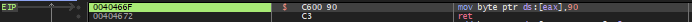 이전에 바로 위에서 40466F 주소에 C39000C6 값을 넣었는데 이 값은 eax 레지스터 값에 해당하는 주소에 90을 넣는다는 의미이다.