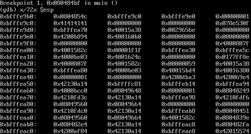 | 0x41 | 0x41414141 | AAAA .... AAAA | 0x41414141 | 0x41414141 |