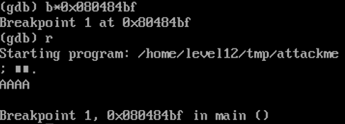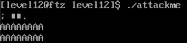 당연하다 위에서 나온 0xbfffe9c0은 tmp 디렉토리 안에 있는 attackme 파일을 실행했을 때의 스택 주소이기 때문에 level12 디렉토리 안에 있는 attackme 파일이 실행될 때의 스택 주소와는 다른 것이다.