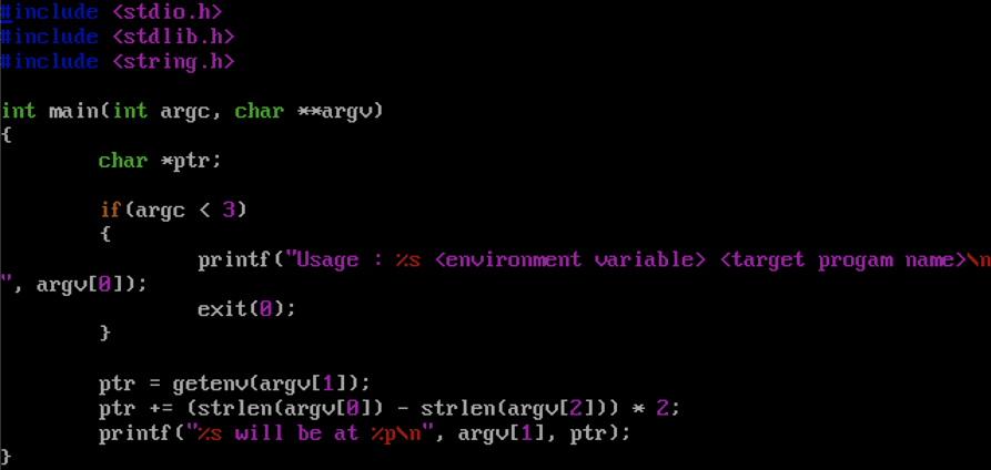 컴파일 한 다음 위와 같이 실행하면 셸코드가 담긴 환경변수의 주소를 가져올수 있다.