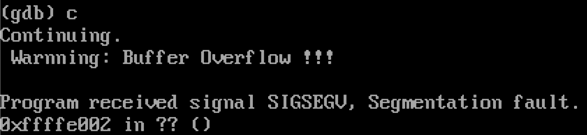 이처럼 버퍼오버플로우 공격을 아래 코드와 같이 인지할 수 있고, "Warnning: Buffer Overflow !!!\n"라는 에러 메시지를 출력하고, 세그먼테이션 에러를 일으키면서 실행된 프로세스를 종료한다.