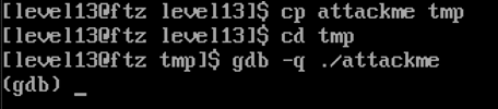 cp 명령으로 attackme 파일을 tmp 파일로 옮긴 후 gdb로 연다.