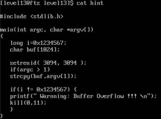 attackme 실행 중 kill(0, 11) 호출하면 호출된 프로세스의 그룹에 속한 모든 프로세스에 11(SIGSEGV)인 세그먼테이션 오류를 전달하기 때문에 버퍼 오버플로우가 발생하면 level13 계정의 attackme 바이너리는 경고문을 출력한 후 세그먼테이션 오류를 일으키면서 종료된다.