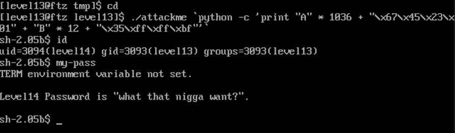 위와 같이 level13 디렉토리로 이동 후 level14 권한이 걸린 attackme 파일에 공격 스크립트를 실행하면 셸을 딸 수 있다.