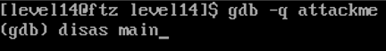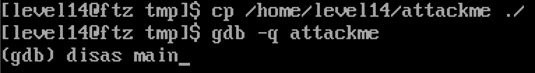 level14의 attackme 파일을 tmp 디렉토리로 가져온 후 gdb로 열고 디스어셈블한다.