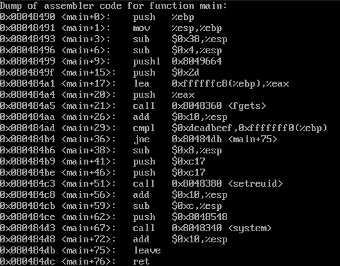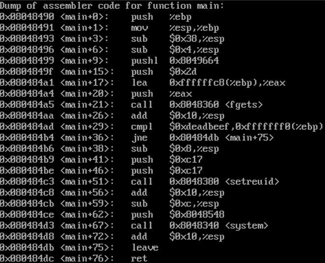이어서 0x080484ad 주소에서 0xdeadbeef와 ebp-0x10 주소에 있는 값을 비교하는 것으로 보아 ebp-0x10 주소에 있는 값은 check 변수의 값을 의미함을 알 수 있다.