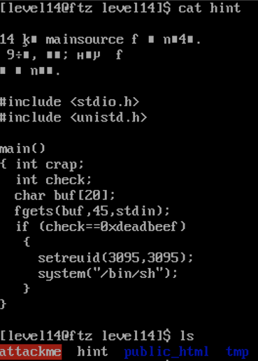 4. check 변수에 0xdeadbeef 값이 있으면 level15 권한으로 프로세스가 실행되도록 설정한 후 셸을 실행한다.