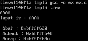 그 다음 스택을 보면 위와 같이 출력되는데, buf의 주소는 0xbfffe510이고, 0x28을 더한 주소인 0xbfffe538 주소가 check 변수의 주소이다.