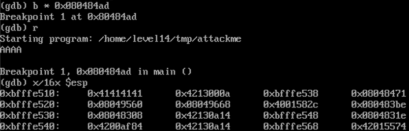 위의 내용을 스택을 보며 확인하기 위해 0x080484ad 주소에 bp를 걸고 실행한 뒤 "AAAA"를 입력해준다.