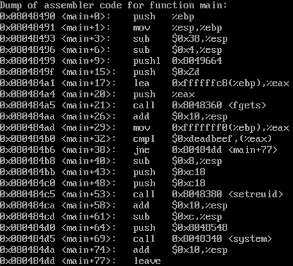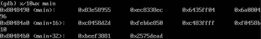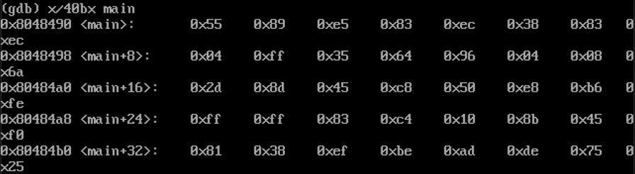 위의 사진을 보면 attackme 파일의 main 함수를 디스어셈블하지 않고 16진수로 된 값들을 그대로 출력시켰을 때 0x080484b2 주소부터 0x080484b5주소까지 0xdeadbeef 값이 보이는 것을 확인할 수 있다.