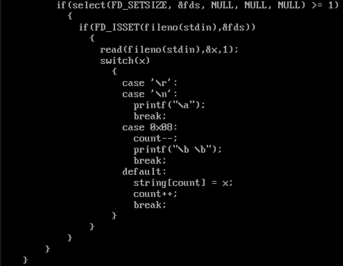 하지만 문제 소스코드에서 count의 값은 0으로 초기화 되어 있고 switch문을 보면 입력한 값이 0x08이면 count의 수가 1 감소되고, 이스케이프 문자 '\b(back space)'를 출력한다.