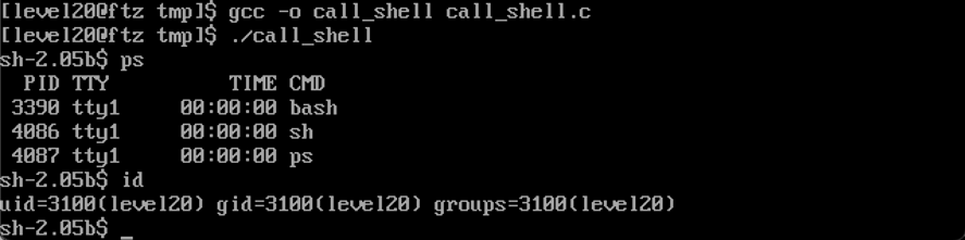 이제 셸코드에 필요한 값인 op code를 16진수로 변환하는 수작업을 거친 뒤 위와 같이 call_shell.c 파일에 위의 코드를 입력한 후 컴파일하여 실행하면 shell이 떨어진다.