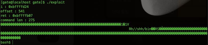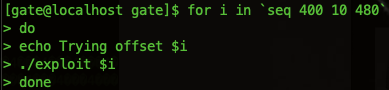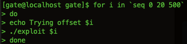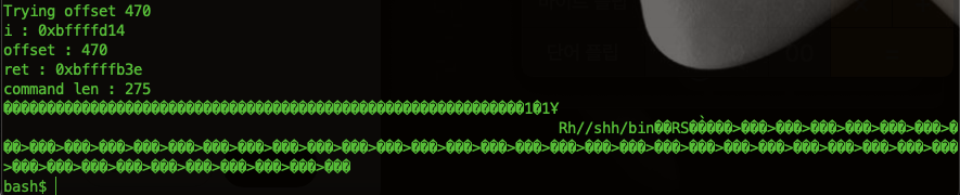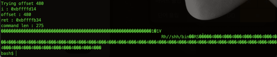 위와 같이 bash shell의 for 루프를 이용하면 offset이 480일 때 &i - 480의 결과에 해당하는 주소를 RET 부분에 덮어씌움으로써 셸을 딸 수 있는 것을 확인할 수 있다.