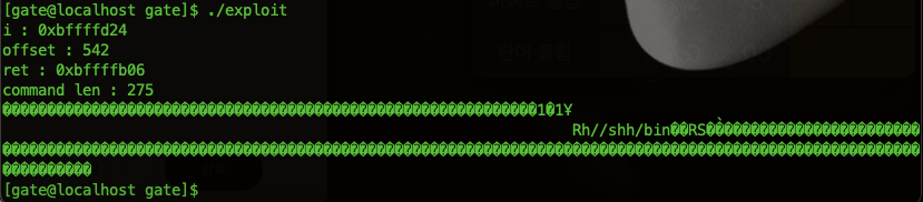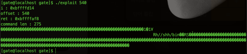 exploit 프로그램은 i의 주소와 &i - offset 값을 출력해주는데, 여기서 &i - offset은 0xbffffd24 - 540으로 0xbffff07 값이고, 이 값은 gremlin의 buffer[256]에 NOP 값이 있는 범위에 속하는 주소이다.