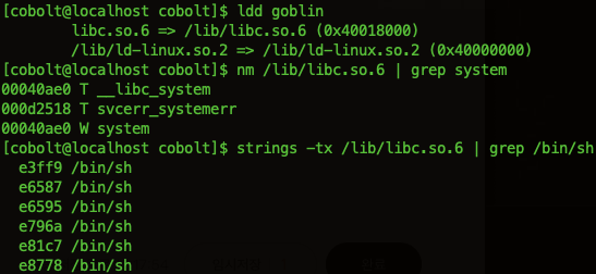 공유 라이브러리에서 system() 함수의 주소 0x40058AE0과 "/bin/sh" 문자열의 주소 0x400FBFF9를 찾는다.