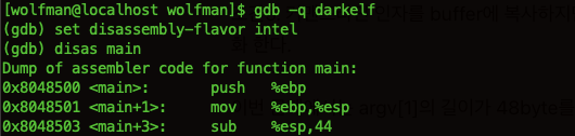 gdb로 darkelf 파일을 열어 디스어셈블 해보면 지역 변수를 위한 스택 공간을 44byte만큼 할당하는 것으로 보아 dummy 값은 없다.