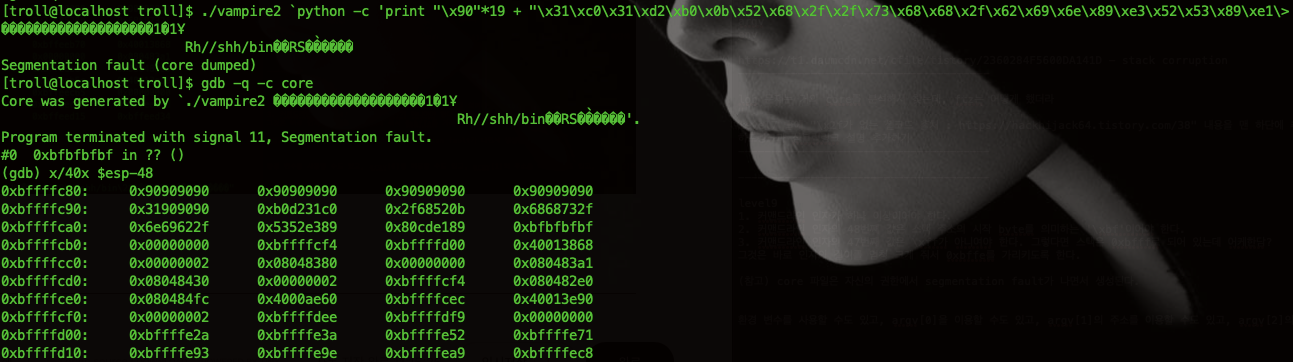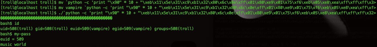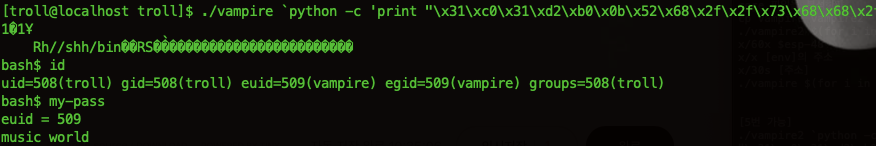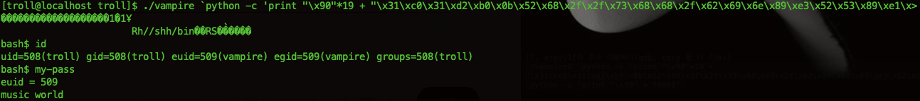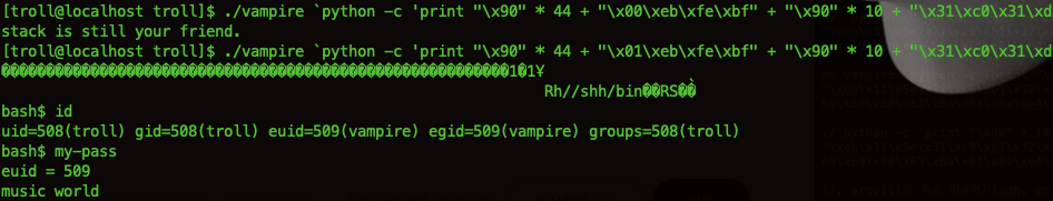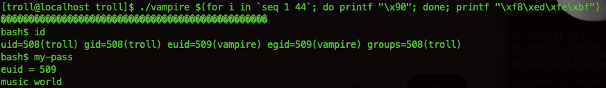 0xbffeeb00 주소를 이용할 때 \x00은 문자열의 끝을 나타내는 의미로 해석되기 문에 \x01로 바꾸어 실행해주면 vampire의 password인 music world를 얻을 수 있다.