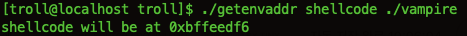 환경 변수 shellcode를 보면 0xbffeedea 주소부터 시작하는데 이는 10byte인 "./vampire2"로 실행했을 때의 주소이므로 9byte인 "./vampire"로 실행할 때는 2byte를 더한 주소인 0xbffeedec 주소로 반환되게 하면 된다.