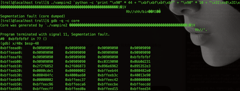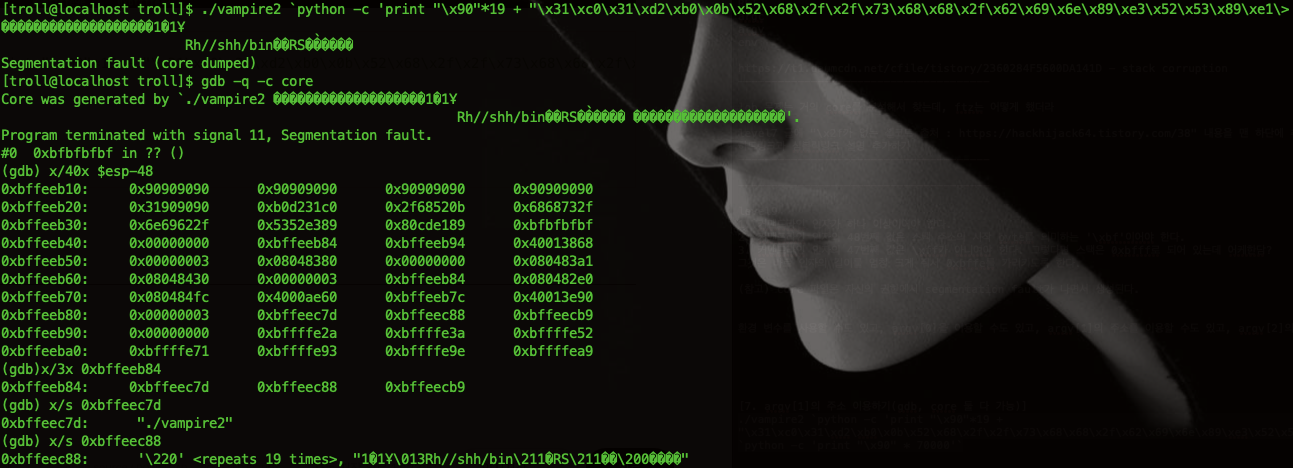 먼저 vampire2 파일의 이름을 NOP + shellcode 형태로 변경해주고, 변경된 vampire2에 테스트용 payload를 인자로 주며 실행하여 core 파일을 생성하고, core 파일을 분석해보면 argv[0]의 주소는 0xbffeebc4이다.
