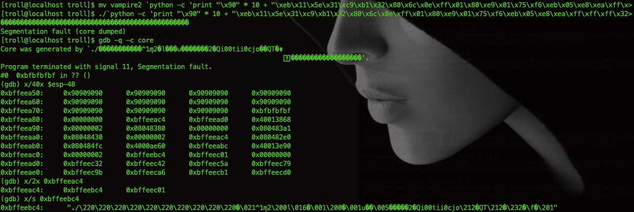env와 argv 영역은 파일 이름의 길이에 영향을 받기 때문에 vampire 파일에 공격을 할 때는 파일 이름의 길이가 1byte 줄어들었으므로 스택 주소에 2를 더해 0xbffeec8a 주소로 반환하도록 해야 한다.