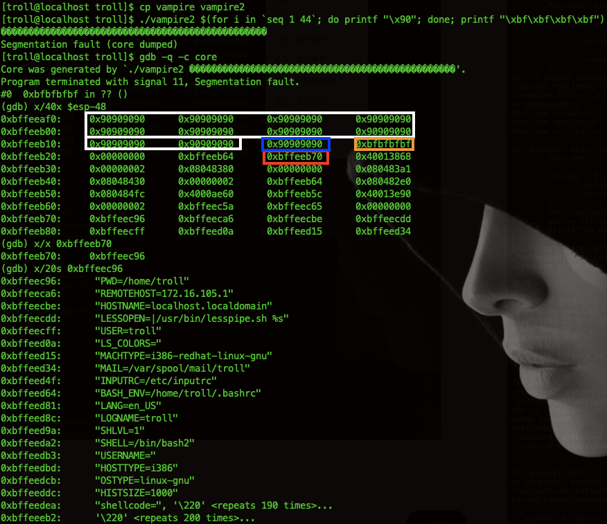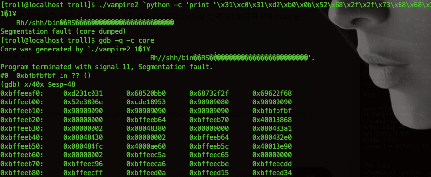 위와 같이 테스트 payload를 인자를 주어 vampire2를 실행해 core 파일을 생성하고 분석해보면 buffer[40]의 주소는 0xbffeeaf0이다.